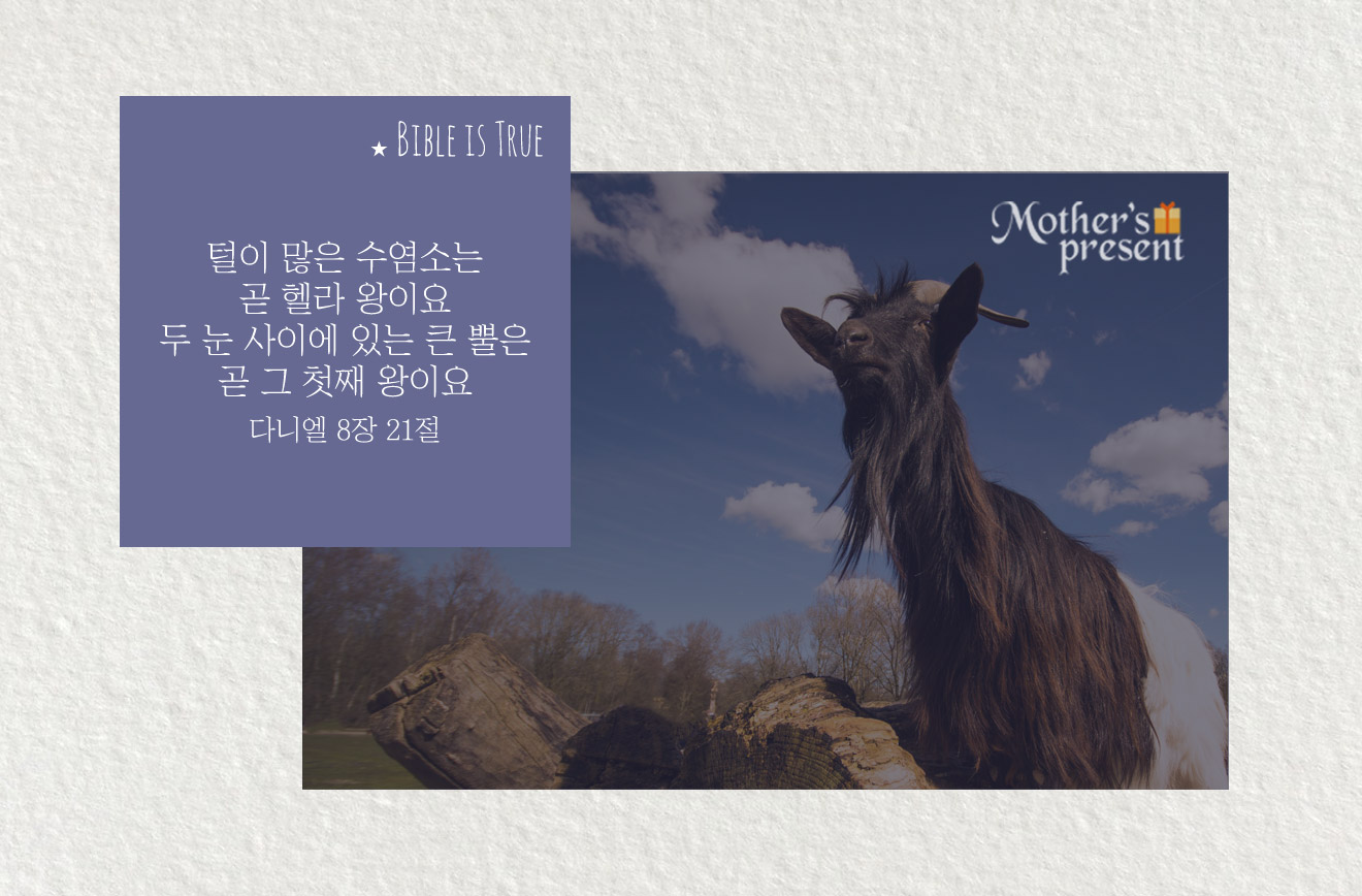수염소 ->헬라 / 수염소의 뿔->헬라 제국 첫째 왕 알렉산더큰 뿔이 꺽이고 ->알렉산더의 죽음 / 네 뿔이 났은즉 ->네 나라로 분열