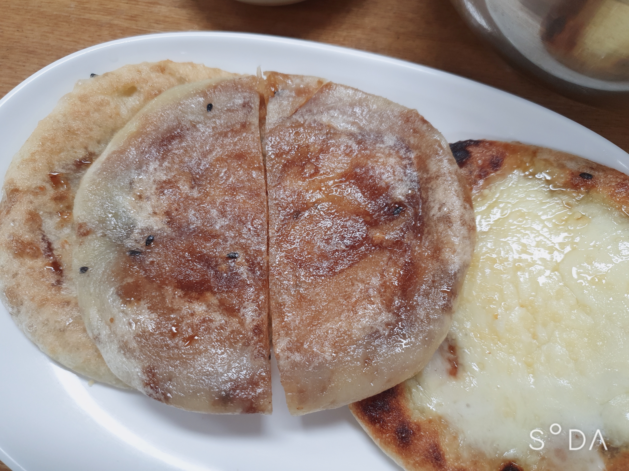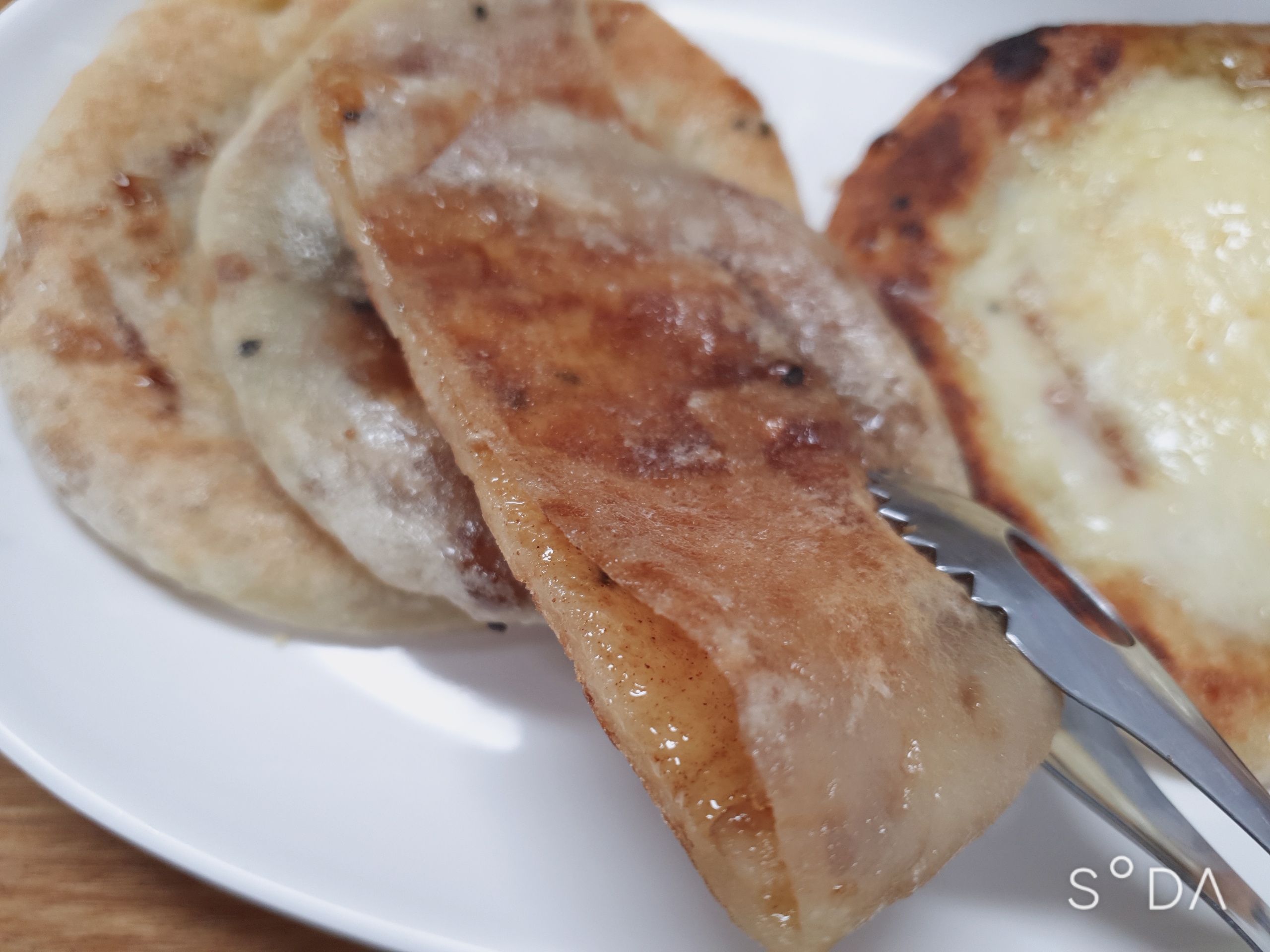호떡반죽에 검은깨가 들어갔고 속은 흑설탕과 시나몬가루에 들어갔어요.